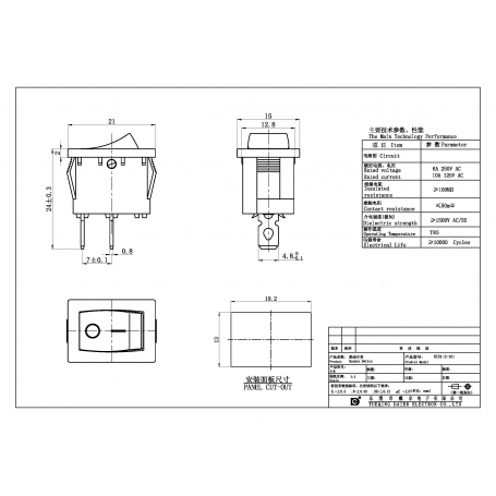 کلید راکر دوحالته مدل KCD1 با 2 پین، جریان نامی 6A در 250VAC، ابعاد نصب 19x12mm و طول بدنه 12mm مناسب کنترل برق AC.